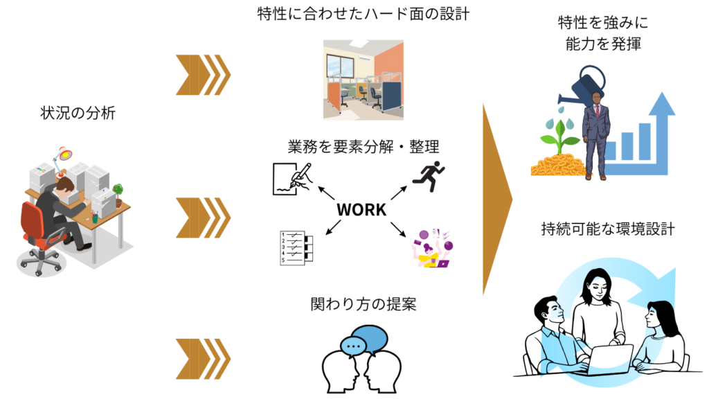 本サービスでは「本人を変える」ことを目的とするのではなく発達特性を理解した上で環境や業務の設計を調整することでパフォーマンスを高めるという視点で支援を行います。 最終的には、特別な支援がなくても組織の中で自然に多様な特性を受け入れられる状態を目指します。
